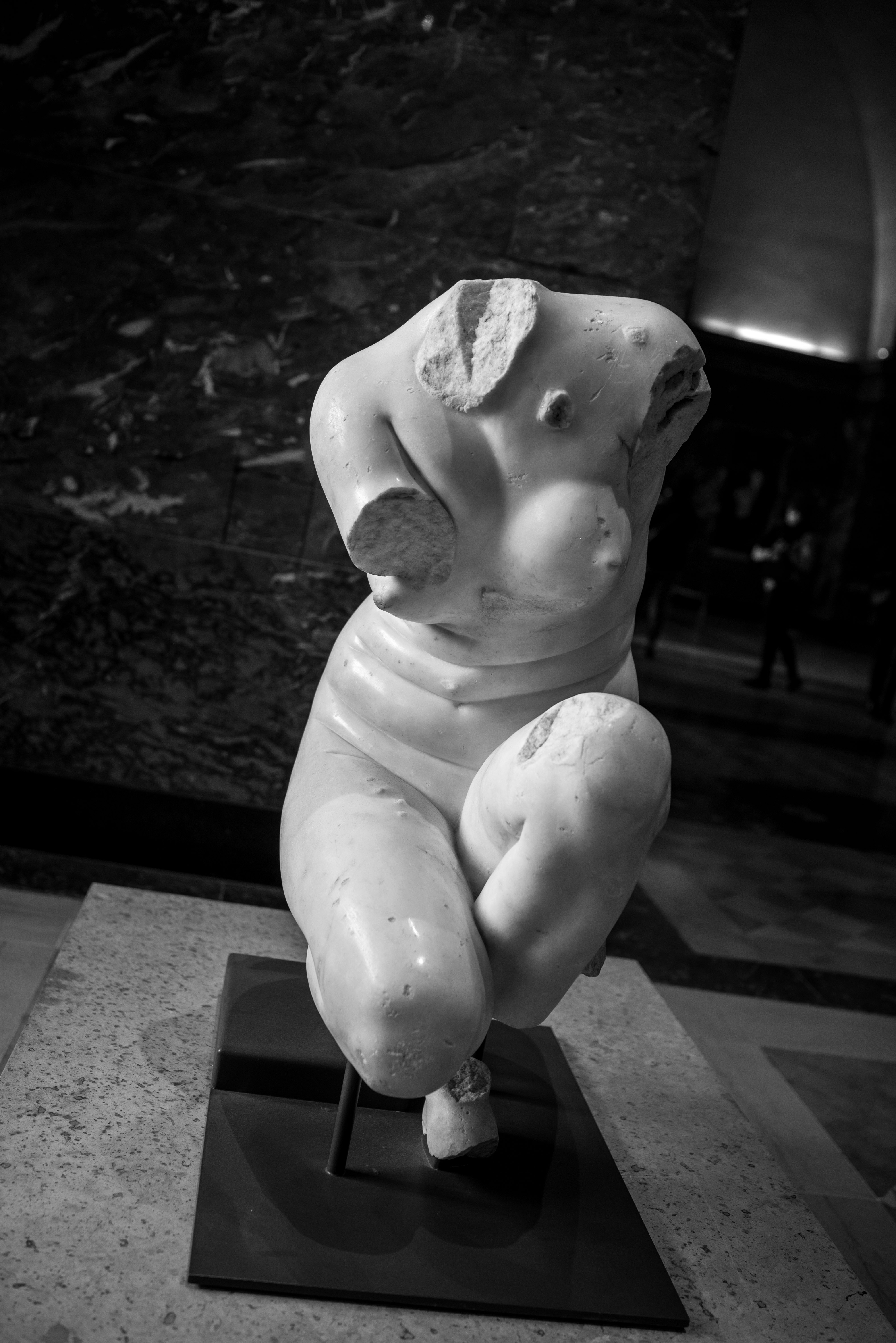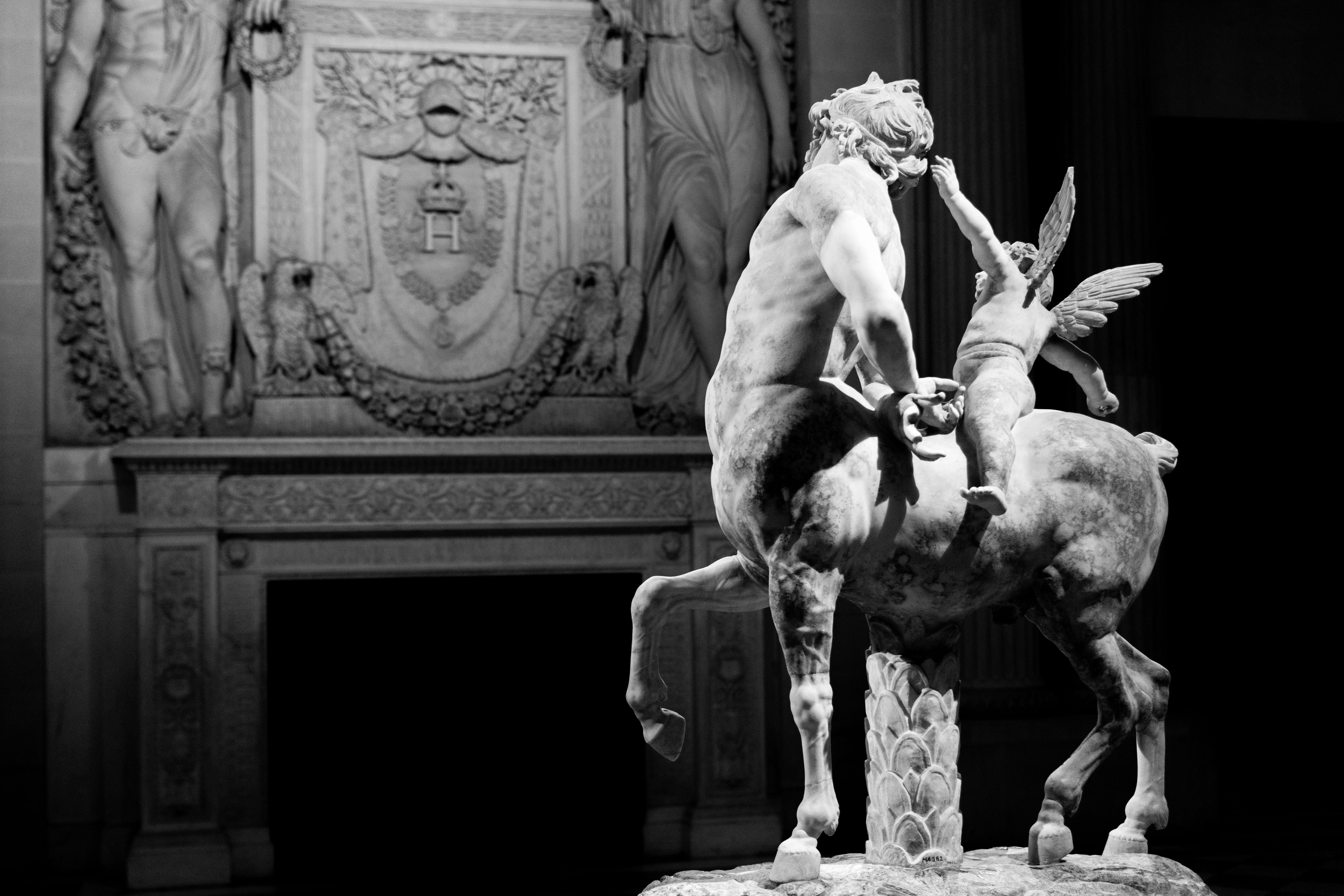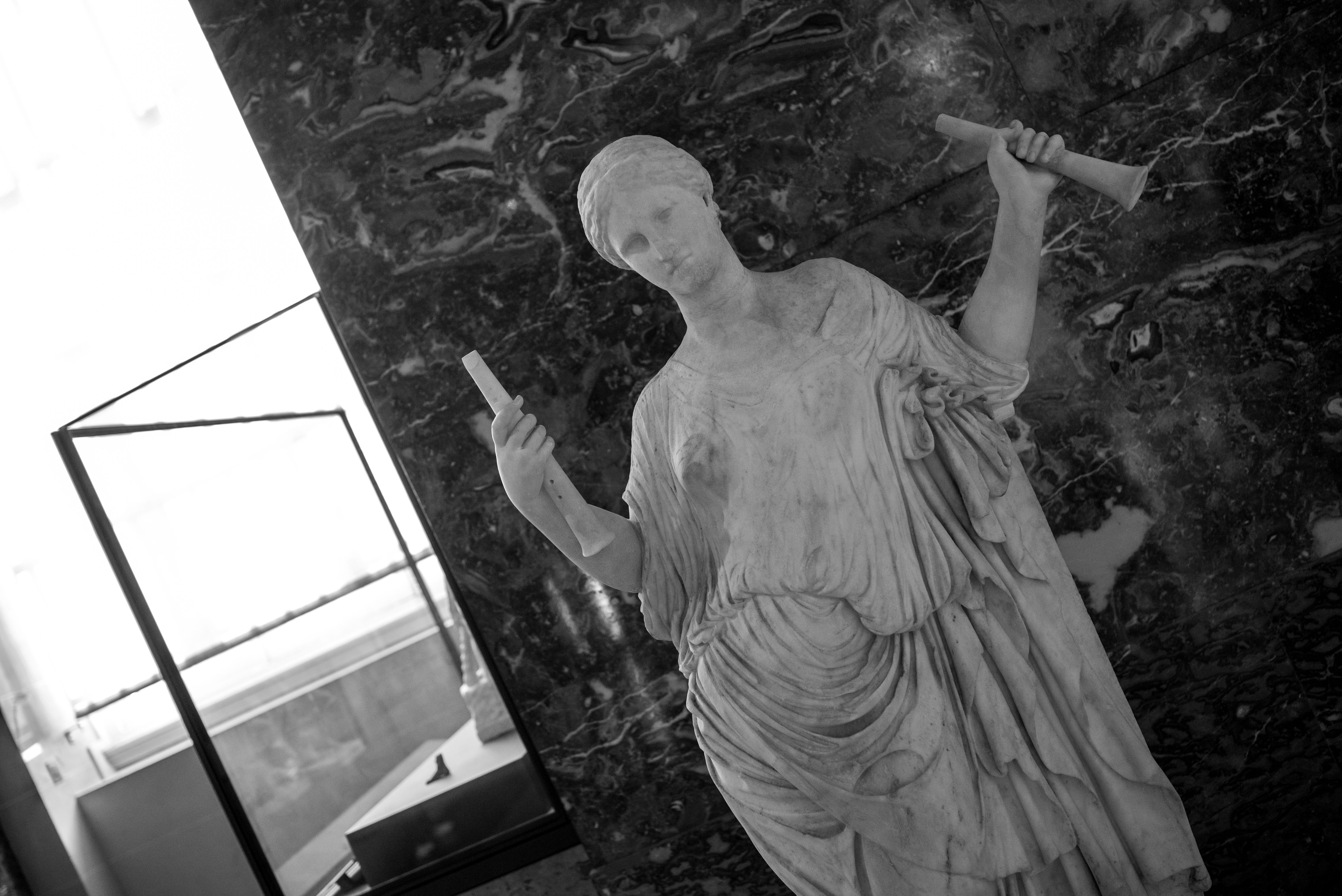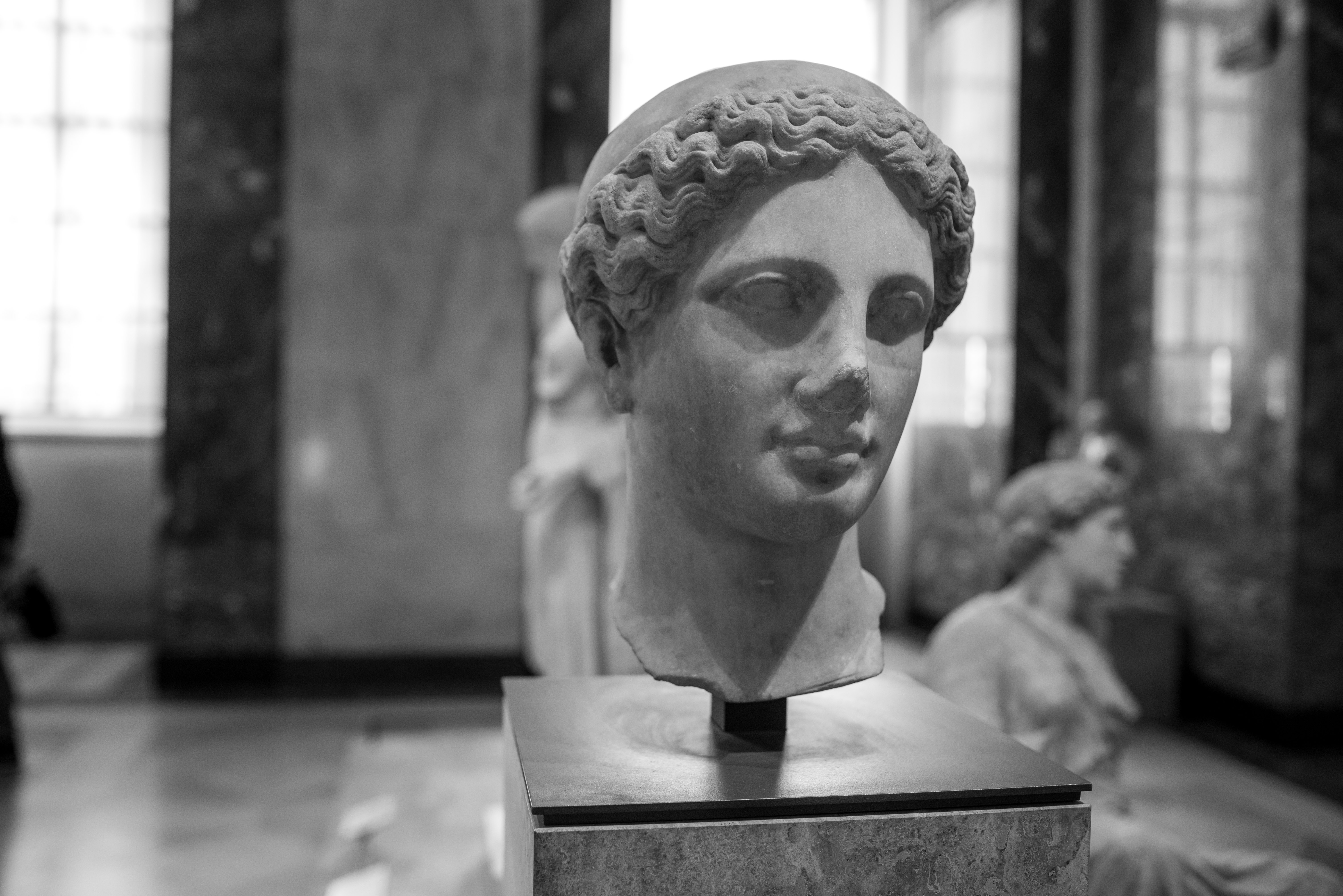 Je me rends souvent au musée du Louvre pour mon agence de communication Booster2Success, qui propose deux parcours escape game pour les entreprises dans le musée : l’un passe dans la majestueuse salle des Caryatides, l’autre dans celle des Vénus. Lors de certains repérages, j’aime photographier les statues : un excellent entraînement au portrait. Voici une série en noir et blanc tirée de ces deux salles.