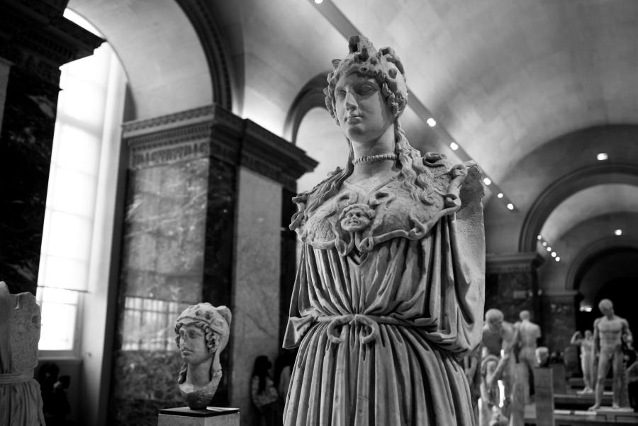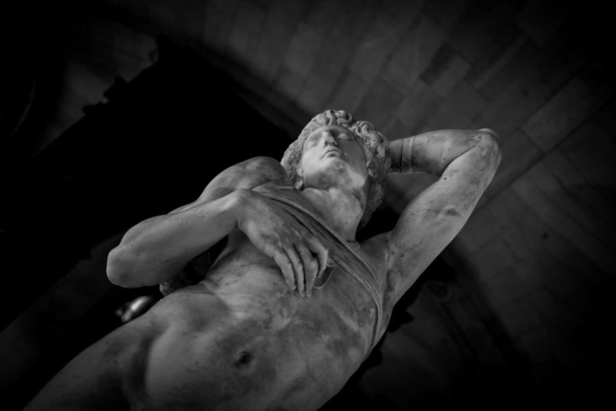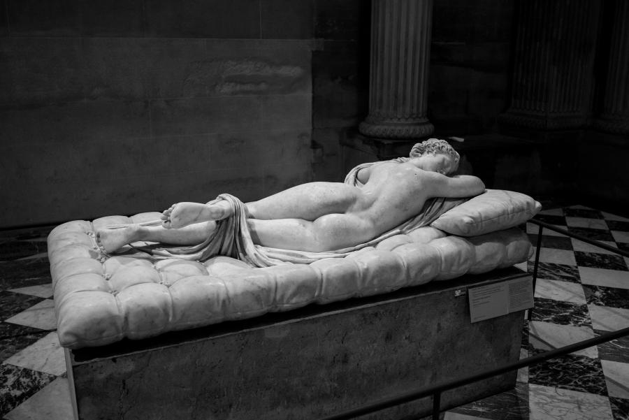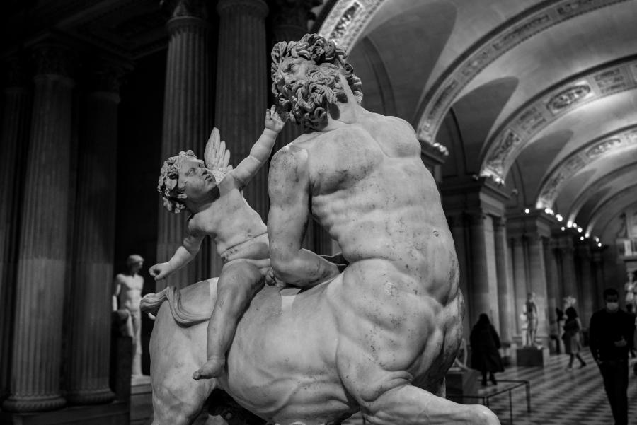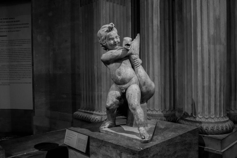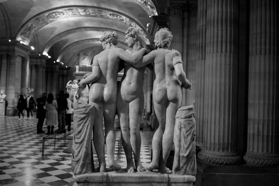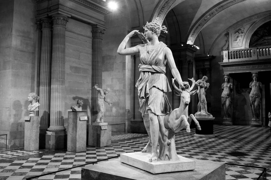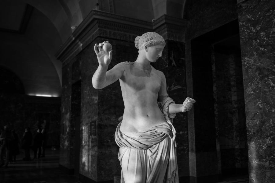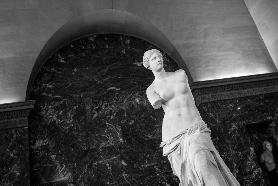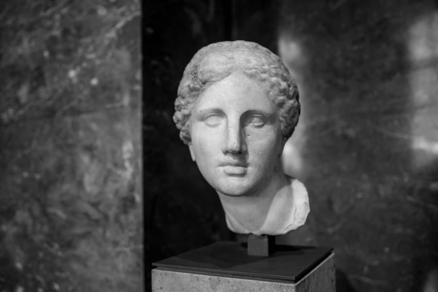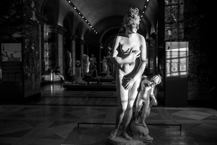 Je me rends souvent au musée du Louvre pour mon agence de communication Booster2Success, qui propose deux parcours escape game pour les entreprises dans le musée : l’un passe dans la majestueuse salle des Caryatides, l’autre dans celle des Vénus. Lors de certains repérages, j’aime photographier les statues : un excellent entraînement au portrait. Voici une série en noir et blanc tirée de ces deux salles.